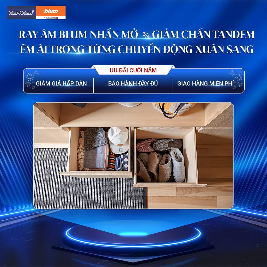 Ray âm Blum nhấn mở ¾ giảm chấn TANDEM mang đến chuyển động êm ái trong từng thao tác, đón