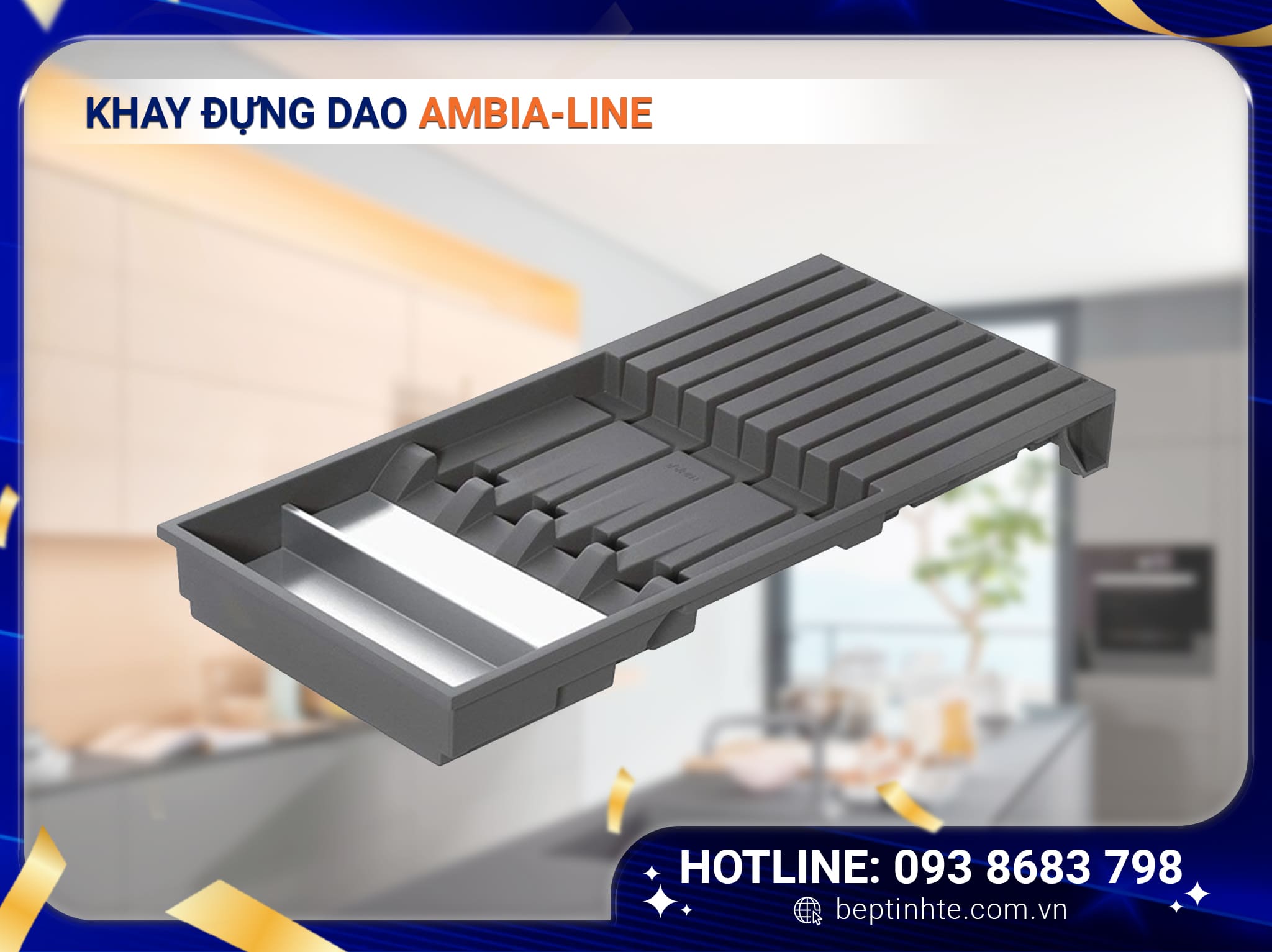 Khay đựng dao AMBIA-LINE có 9 rãnh, hỗ trợ cất giữ an toàn và gọn gàng cho 5 dao nhỏ và 4 dao lớn. Nhờ có chân chống trượt nên có thể lắp khay độc lập trong ngăn kéo (chiều sâu tối thiểu của ngăn kéo là 450mm) hoặc được lồng vào khay chia RS2/RH2.
