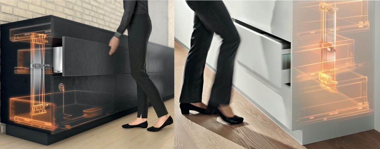 Với SERVO-DRIVE cho ngăn kéo, chỉ cần chạm nhẹ vào bất kỳ vị trí nào trên mặt trước ngăn kéo hoặc kéo nhẹ tay nắm là ngăn kéo sẽ tự động mở ra hoàn toàn, do vậy, chúng ta có thể mở bằng tay, chân, hông hoặc gối theo cách thoải mái nhất. Ngăn kéo sẽ được đóng lại một cách nhẹ nhàng, êm ái nhờ tính năng giảm chấn BLUMOTION tích hợp trên ray trượt.