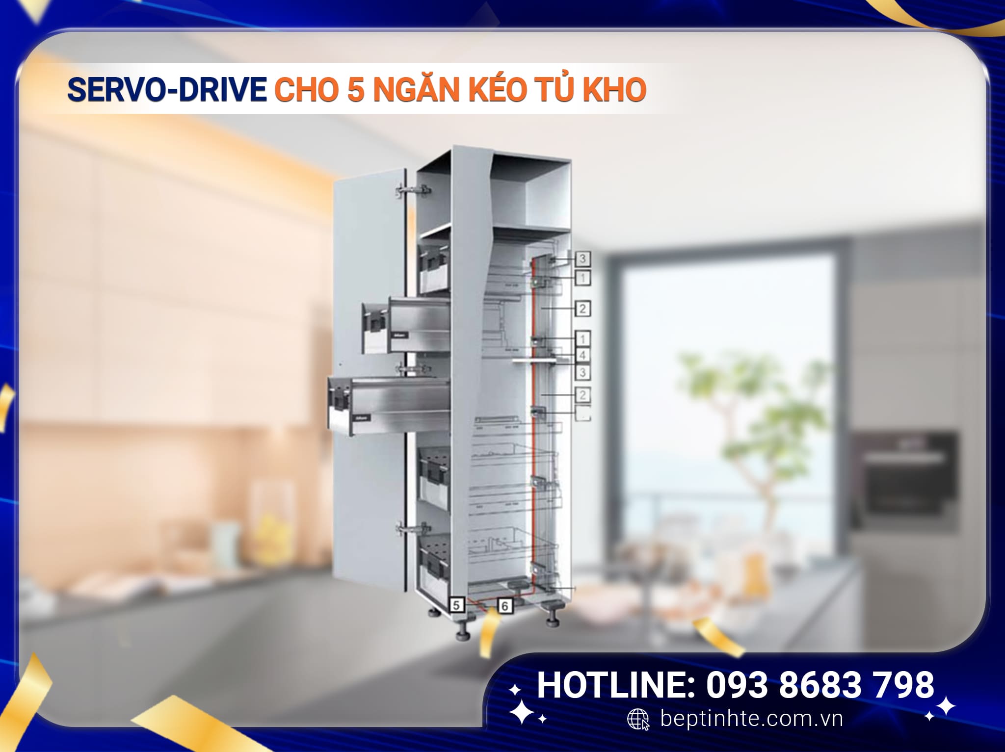 Với SERVO-DRIVE cho ngăn kéo, chỉ cần chạm nhẹ vào bất kỳ vị trí nào trên mặt trước ngăn kéo hoặc kéo nhẹ tay nắm là ngăn kéo sẽ tự động mở ra hoàn toàn, do vậy, chúng ta có thể mở bằng tay, chân, hông hoặc gối theo cách thoải mái nhất. Ngăn kéo sẽ được đóng lại một cách nhẹ nhàng, êm ái nhờ tính năng giảm chấn BLUMOTION tích hợp trên ray trượt.