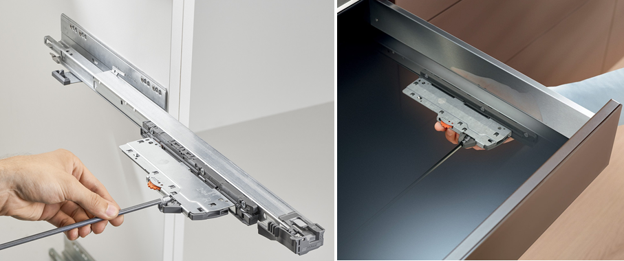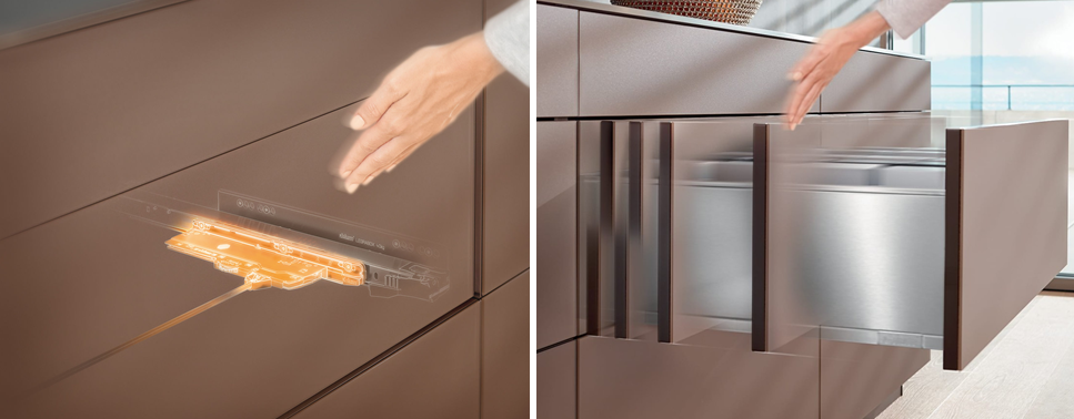 TIP-ON BLUMOTION hỗ trợ mở ngăn kéo bằng cơ, chỉ cần nhấn nhẹ vào vị trí bất kỳ của mặt trước ngăn kéo và nhả ra thì ngay lập tức ngăn kéo sẽ tự động mở. Khi đóng ngăn kéo, chức năng giảm chấn BLUMOTION tích hợp sẵn trên ray trượt được kích hoạt, đảm bảo chuyển động luôn mượt mà cho dù lực đẩy vào mạnh hay yếu.
