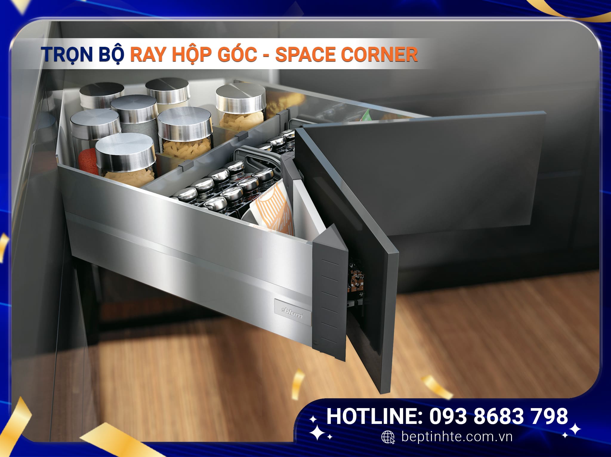 Tại Việt Nam có hai dòng ray hộp góc Tandembox X1 và X6, tương ứng với chiều cao 83mm và 205mm, có 2 tùy chọn màu sắc xám nhạt và trắng sữa. Các tổ hợp thường được ứng dụng triển khai thực tế tủ góc bếp gồm 2X6 (2 ngăn kéo thành cao), 1X1 + 2X6 (1 ngăn kéo thành thấp ở trên, 2 ngăn kéo thành cao bên dưới) hoặc 2X1 + 1X6 (2 ngăn kéo thành thấp ở trên, 1 ngăn kéo thành cao bên dưới). Space Corner kết hợp với hệ thống phân chia Orga-Line giúp sắp xếp gọn gàng, ngăn nắp vật dụng bên trong ngăn kéo.