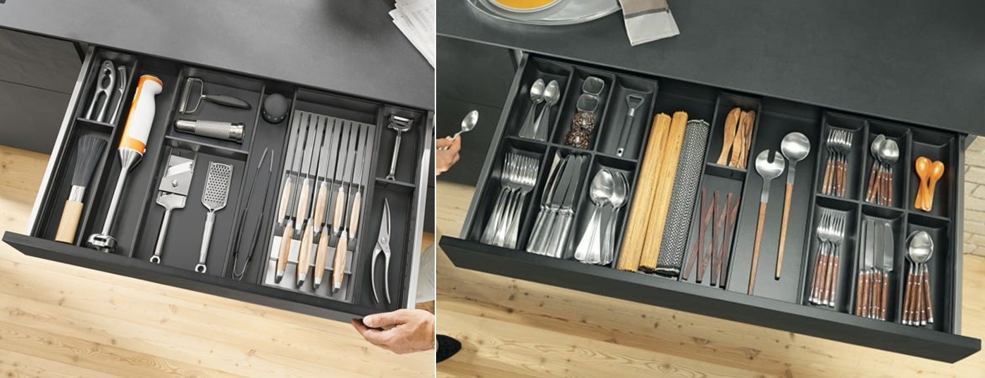 Nhờ có khay chia mà các vật dụng được sắp xếp ngăn nắp gọn gàng, có thể quan sát bao quát và thoải mái lấy ra hay bỏ vào. Một số sản phẩm Ambia-Line kết hợp tối ưu với Legrabox M: