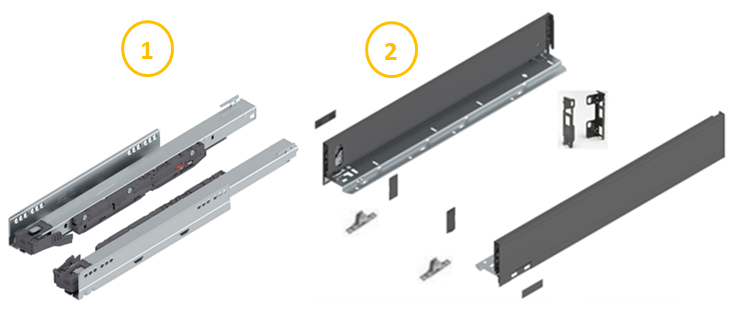 Trọn bộ ray hộp Legraobx M có 6 thành phần chi tiết, để thuận tiện cho việc đặt hàng và giao hàng, Blum VN chia làm 2 thành phần. Mỗi thành phần được đóng gói hộp giấy và có mã đặt hàng riêng.