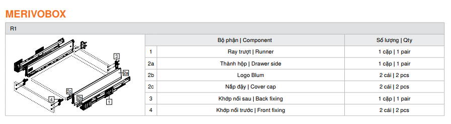 | Trọn bộ ray hộp MERIVOBOX R1 | ||