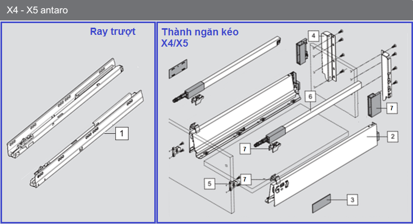 | 2. Thành hộp | 1 cặp trái, phải | Bộ thành ngăn kéo X5 | ||