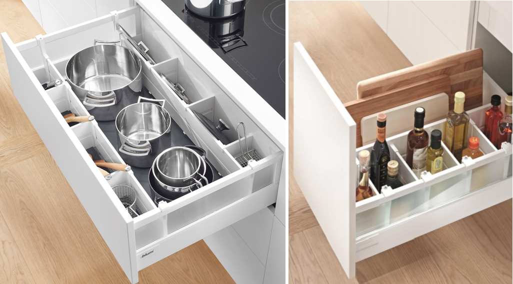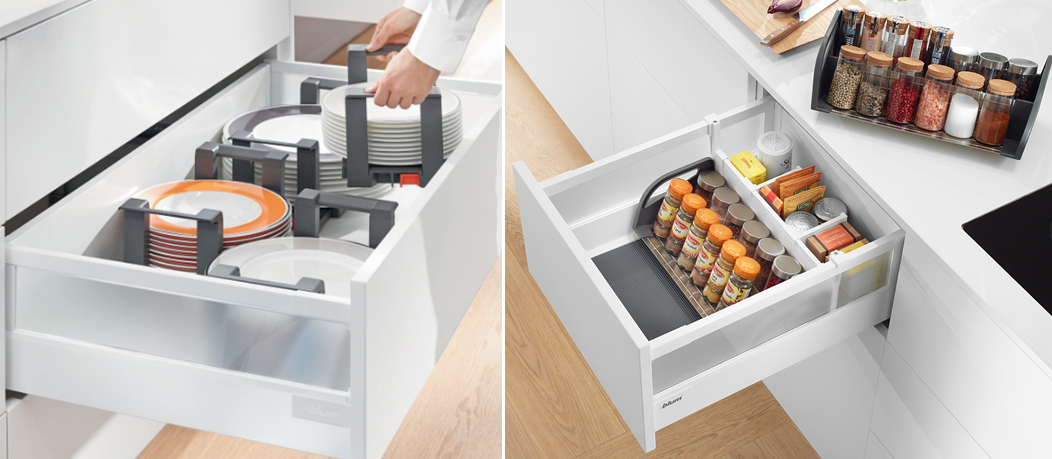 Ray hộp X5 cũng kết hợp với các Thanh chia ngang dọc, Khay tô đĩa, Khay gia vị, Kệ chai lọ để sắp xếp vật dụng ngăn nắp một cách dễ dàng nhờ lợi thế chiều cao 205mm.
