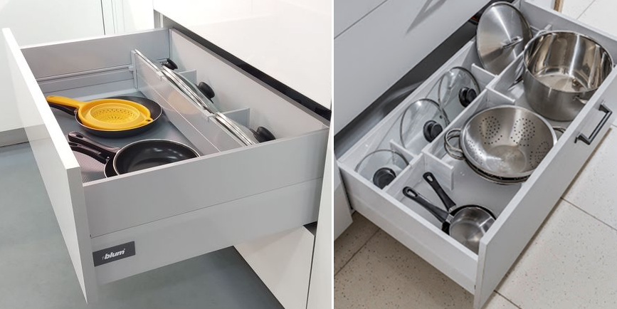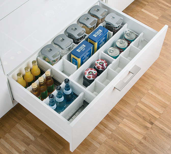 Ray hộp X6 cũng kết hợp với các Thanh chia ngang dọc, Khay tô đĩa, Khay gia vị, Kệ chai lọ để tối ưu công năng. Công nghệ giảm chấn Blumotion đã được tích hợp sẵn, có thể nâng cấp lên giảm chấn nhấn mở tip-on Blumotion hoặc mở ngăn kéo bằng điện Servo-Drive.