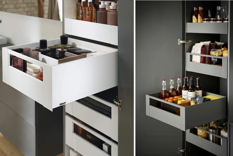 Tủ kho / tủ lưu trữ / tủ đồ khô LEGRABOX (LEGRABOX Space Tower) có cấu tạo từ các ray hộp âm LEGRABOX IM, IC với 2 tùy chọn màu sắc là xám hoặc trắng sữa. Cấu hình tiêu chuẩn bao gồm 1 bộ ray hộp âm IM 40kg được lắp ở vị trí cao nhất, 4 bộ ray hộp âm IC 40kg được lắp ở các tầng bên dưới và 4 bộ bản lề ngăn kéo âm mở 155°.