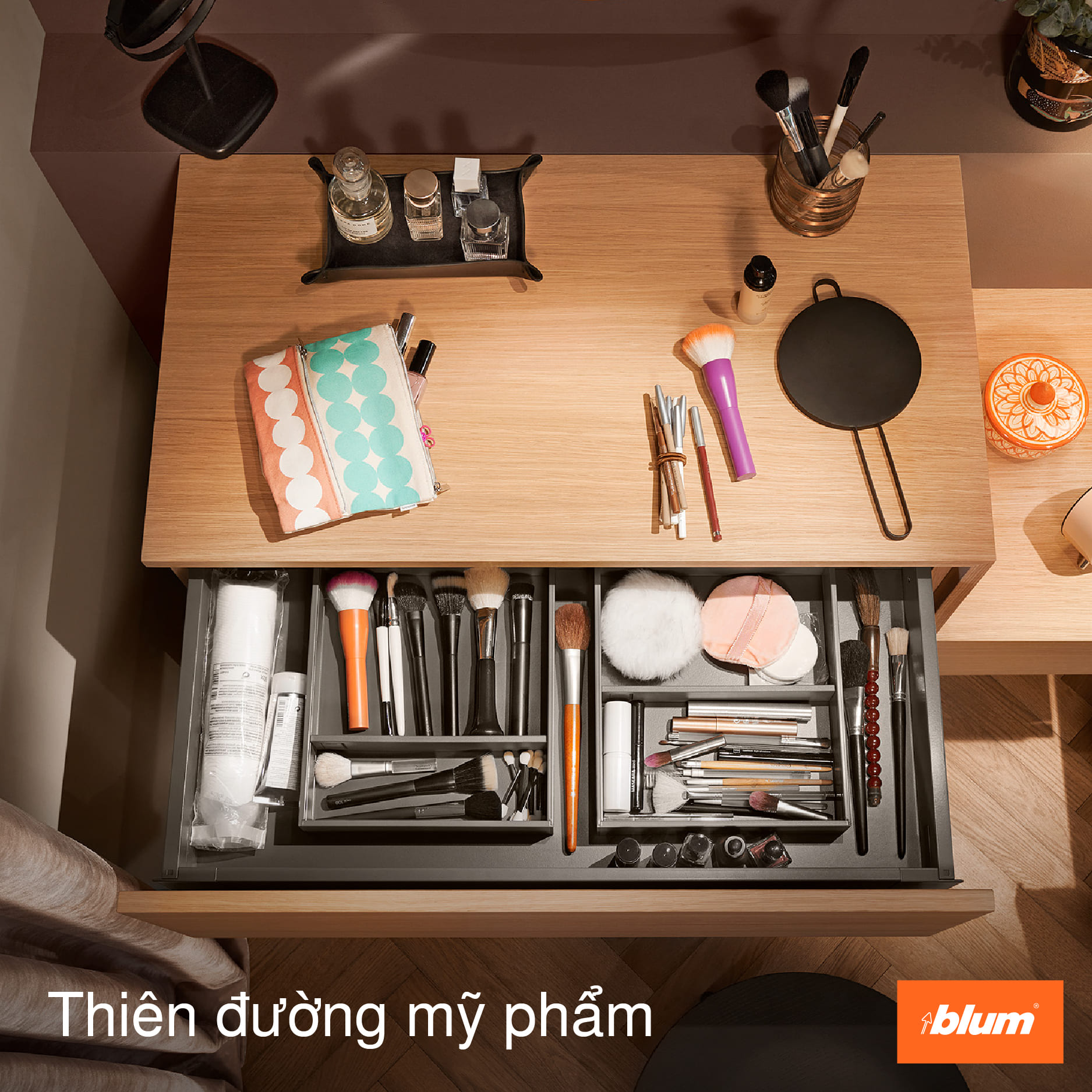 Tiện ích và thẩm mỹ: Không chỉ nâng cao trải nghiệm sử dụng, Blum TANDEMBOX còn làm gọn gàng không gian ngăn kéo, giữ mọi vật dụng ở vị trí cố định.